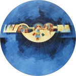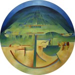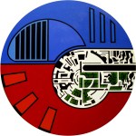 Using a circular form is not new to art, but my motivation was a series by Harold Town, “Tyranny of the Corner”. The “full circle” exhibit and these pieces was to eliminate the corner from the matrix, to force a different design paradigm on the image concept with different rules. The themes evolved as with the square canvases during this eight year period. I also tested the half circle or arc shape.